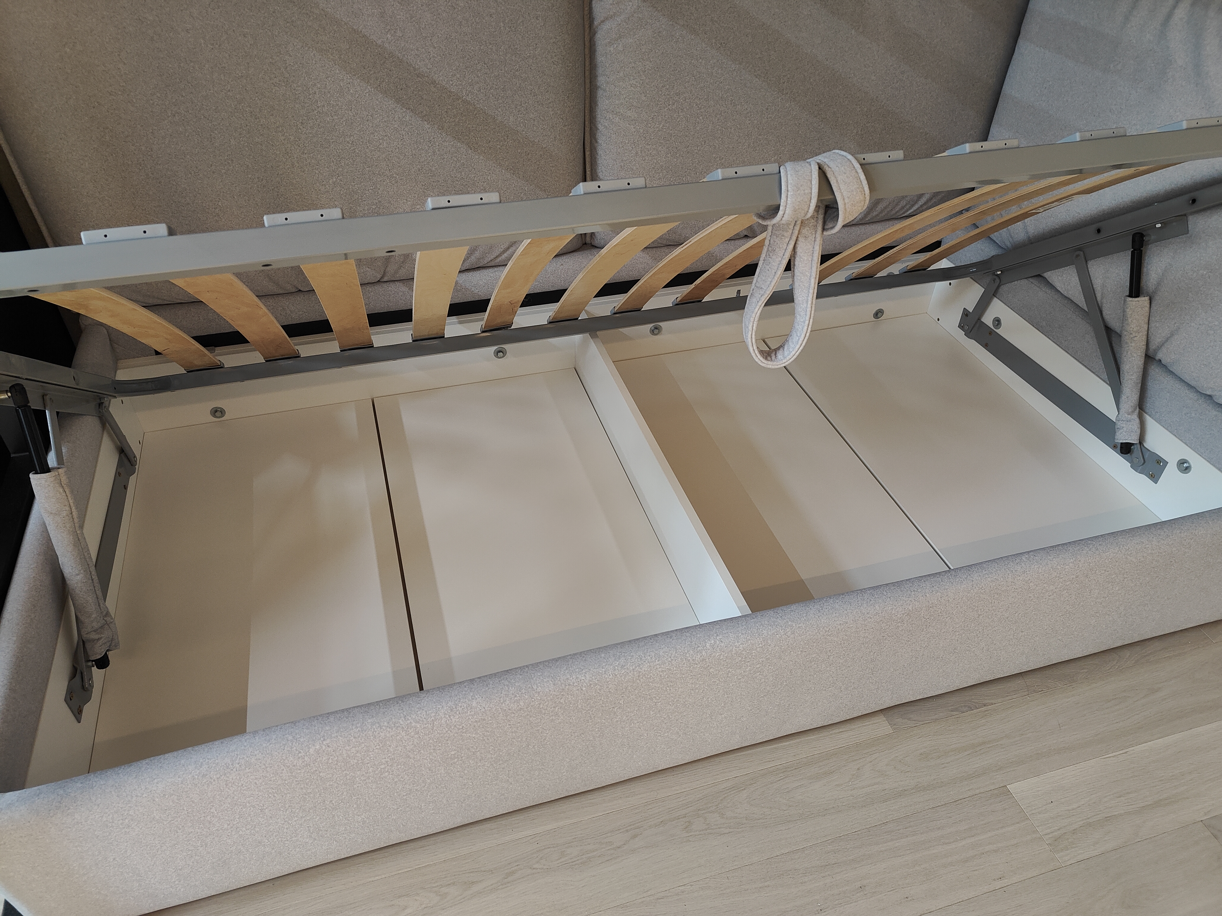Кровать может комплектоваться механизмом подъема спального места (на двух газлифтах) и встроенными коробами для хранения принадлежностей (днища коробов съемные).